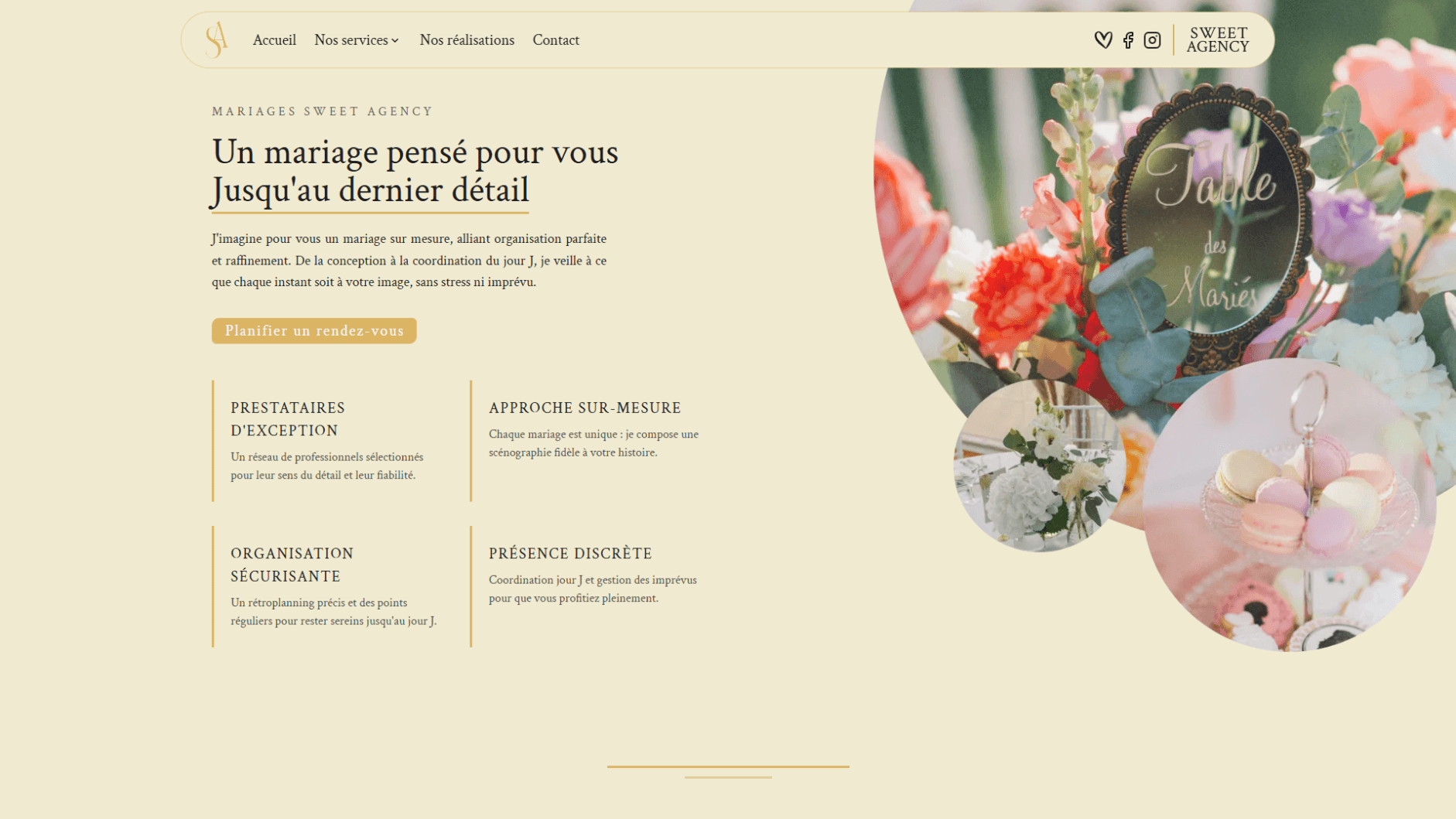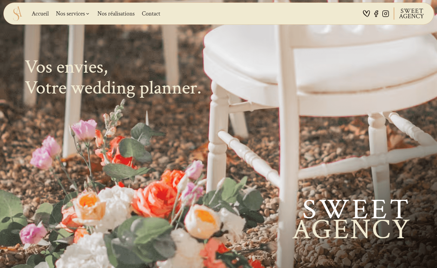 Site web vitrine élégant et moderne pour Sweet Agency, agence de wedding planning spécialisée dans l'organisation d'événements sur mesure : mariages, événements privés et professionnels, avec services de location de mobilier.